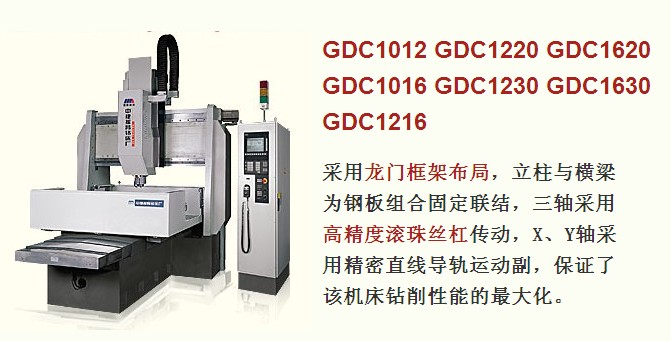 GDC系列机床采用龙门框架布局,立柱与横梁为钢板组合固定联结,三轴采用高精度滚珠丝杠传动,X、Y轴采用精密直线导轨运动副,保证了该机床钻削性能的最大化。